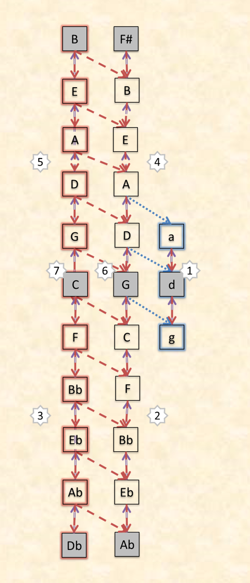 As a first attempt at composition using KCM,  in each of the following studies a diagram is presented and then a pattern played through that diagram.  The pattern choosen on the diagram is the simplest pattern possible: a connected path or loop though the diagram.  We then play one bar for each mode we traverse in sequence.